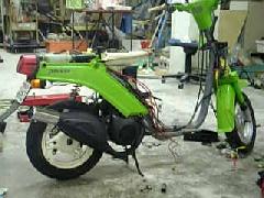 縦型ジョグ(2JA)エンジンを搭載致しました!後、RタイヤをD306 の3.50?10を装着しタイヤ径でハイギヤ化しました(サスのスプリングにタイヤの横が当たる為、タイヤの横をサンダーで削り装着)(FタイヤはD306の300?10です)デザイン的にはミシュランS1が良かったのですが、目視ではタイヤの直径はD306のほうが5ミリ程高い感じがします!後、Rタイヤ交換後の全体的な走りの方は特に中高速がかなり良くなります!後、最近良くスーパーカブと間違えられます。また虫のバッタに似ていると好調です!