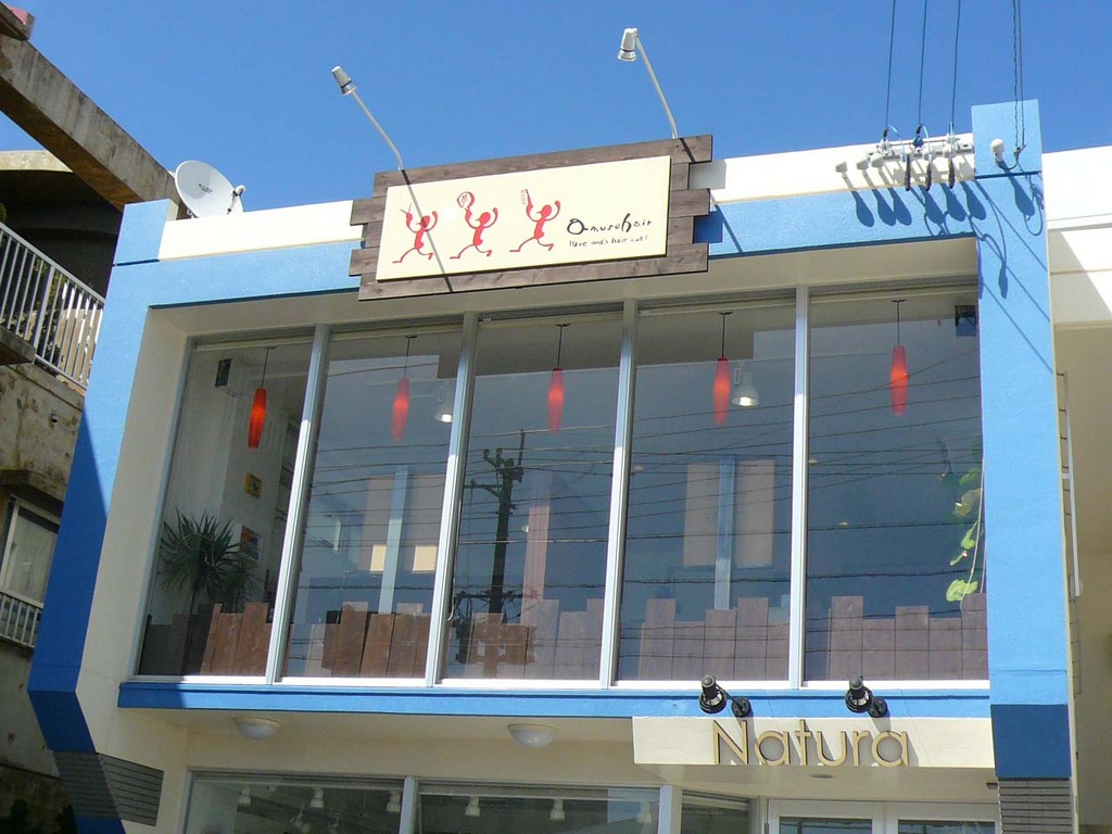 那覇国際高校近く、白とブルーのビル2階にある美容室。