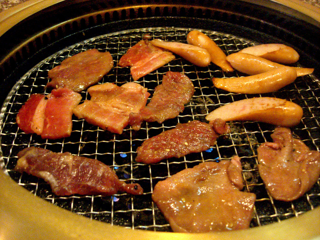 カルビ、ロース、ハラミ、タン(タレ味)、豚バラ、レバー、鶏モモ肉、イカ焼き、トントロ、ウィンナー、ユッケ、豚足、ビビンバ、クッパ、ライス、キムチ、カクテキ、オイキムチ、ナムル、わかめスープ