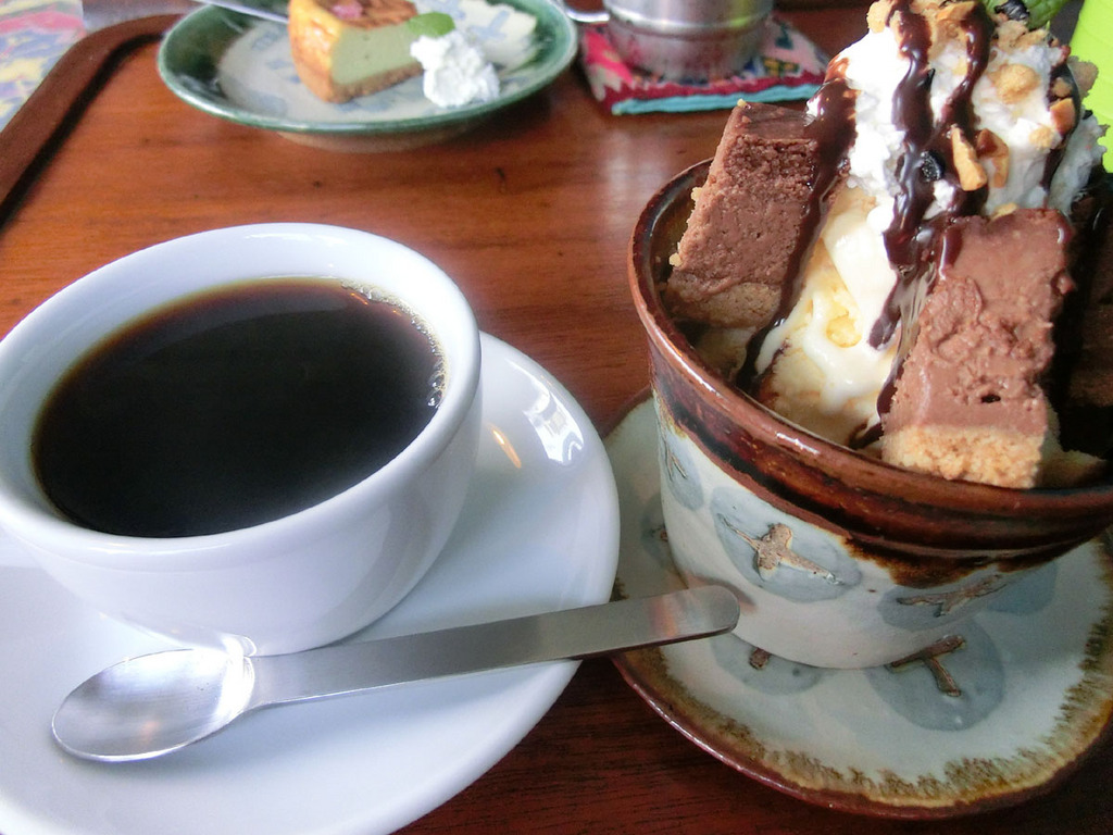 チョコレートチーズケーキとハニーカフェラテ。濃厚なケーキはコーヒーとの相性抜群! |