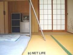 6畳の和室になります。エアコン、テレビ、冷蔵庫、ベッド、座椅子、家具等が用意されていますのでアパート感覚でのんびりとくつろげます。グループやご家族でのご利用にお薦めです。