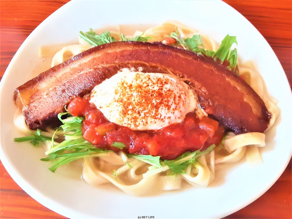 【国際通りすぐ!!】 TV紹介で限定30食のとろけるラフテータコライス&そば&サンドが大人気☆ シャキシャキの水菜にピリ辛サルサソース、とろけるスパイシーなラフテーにまろやかな温玉が乗ったタコライスです♪
